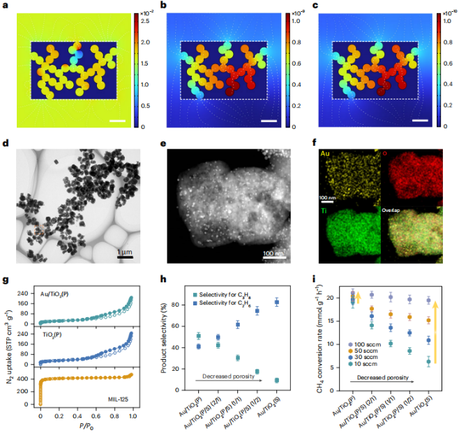 我国具有十分丰富的页岩气资源,已探明可采储量居全球第一。在清洁能源驱动下,将页岩气的主要成分甲烷高效、高选择性催化转化为高附加值碳氢化合物对于实现碳资源高值化利用意义重大。然而,传统甲烷光催化氧化偶联工艺面临甲烷转化率低、反应稳定性差等问题,且产物主要为气态乙烷,储运成本相对较高。基于此,研究团队开发出一种多孔二氧化钛封装金纳米颗粒的新型光催化剂,通过蒸汽活化策略,在太阳光照射下实现甲烷高选择性氧化偶联制备丙烷,产率和选择性分别高达1.4毫摩尔每小时和91.3%,性能显著优于已报道催化体系。此外,相比于气态乙烷产物,丙烷可在常温下实现液化,从而显著降低了储运成本。机理研究表明,蒸汽活化能够使金纳米颗粒表面产生晶格拉伸应变,改变其电子结构,从而增强对反应中间体的吸附,促进甲烷深度偶联为丙烷。同时,多孔二氧化钛框架内的纳米限域催化微环境能够有效延长反应中间体停留,从而进一步提高甲烷深度偶联效率。本研究为页岩气资源的高效、高附加值利用提供了新策略,对推动光驱动甲烷转化技术发展具有重要意义。