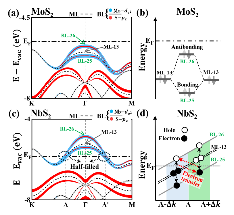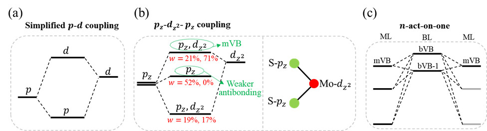二维材料及其异质结中的层间轨道作用 (IOI) 是实现物性调控的关键机制,也是推动层间工程研究的重要基础。然而,先前对IOI的描述主要基于两能级框架模型(每层提供一个能级),其隐含假设是一个轨道对应一个能级,如p-d耦合模型 (下图a)。然而,在实际材料中,一个原子轨道会分布在多个能级上,这导致二维晶体中轨道作用必须考虑多能级作用。本研究以MoS2为例,揭示了其S-pz轨道通过pz–dz2–pz耦合分布于三个能级(下图b),从而在层间形成“多对一”层间作用,即多个能级共同作用于相邻层的一个能级,如价带顶 (下图c)。本工作的多能级视角不仅有助于加深对二维材料层间作用的理解,还可以通过多能级作用更加有效地调控二维材料物性。