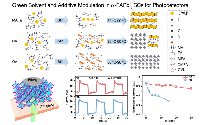 甲脒铅碘钙钛矿(FAPbI₃)因其优异的光电性能,被认为是下一代高性能光电器件的理想材料。然而,其在室温下易发生α相到δ相的非预期相变,且传统制备过程依赖有毒溶剂,严重制约了其实际应用。针对上述挑战,研究团队提出一种绿色溶剂-添加剂协同策略,采用生物质来源的γ-戊内酯(GVL)替代传统有毒溶剂γ-丁内酯(GBL),并结合还原性酸(如草酸)作为添加剂,成功实现了α相FAPbI₃单晶的稳定制备。研究发现,GVL通过形成FA⁺-GVL氢键和高价态[PbIₓ]²⁻ˣ簇,显著提升前驱体稳定性;同时,研究首次发现一种溶剂参与型中间体δ-FAPbI₃-GVL,该中间体可在60℃低温下转化为α相,有效降低相变能垒。添加剂调控机理研究表明,H⁺与还原性基团发挥协同作用:H⁺促进FA⁺解离,还原性基团抑制MA⁺去质子化,二者共同实现对δ相的有效抑制。基于该策略,团队制备出FA₀.₉MA₀.₁PbI₃单晶薄膜,其缺陷密度低至8.3×10¹¹ cm⁻³。以此构建的自供电光电探测器在零偏压下展现出优异性能:响应度达14.5 mA/W,探测率为3.75×10¹⁰ Jones,响应速度为149/65 μs。尤为重要的是,未封装器件在室温环境中存放30天后性能仅衰减17%,展现出卓越的环境稳定性。